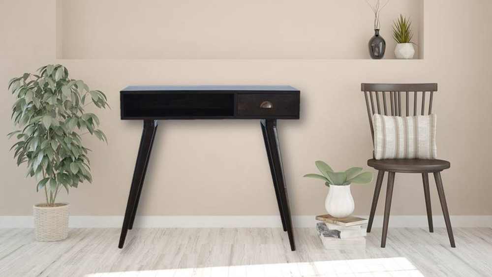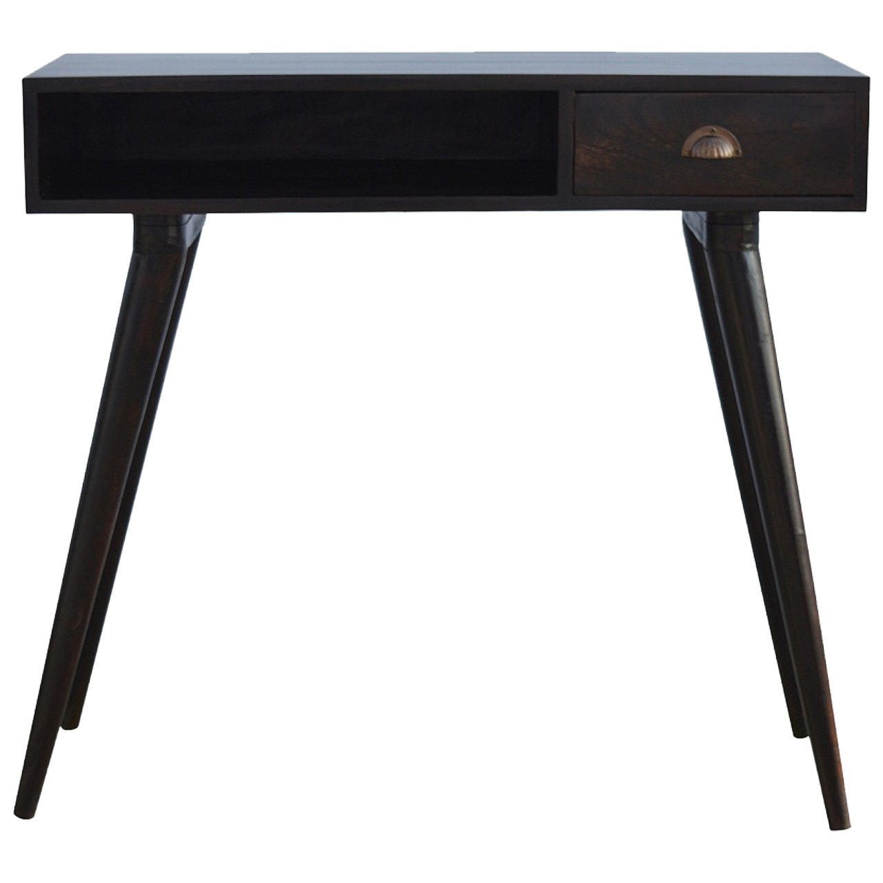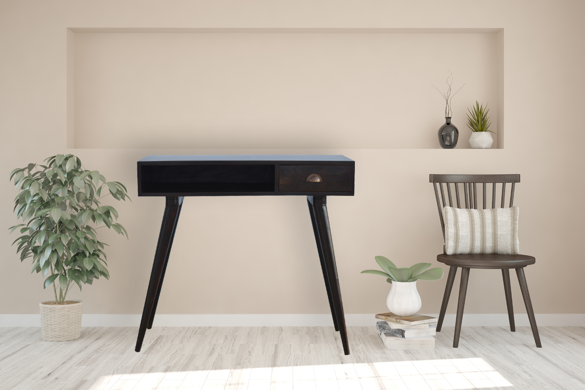 Inspired by both a vintage and modern design, this solid wood writing desk provides ample space for you to work on. It has been constructed from 100% solid mango wood with Nordic style legs in a walnut finish. Other features include 1 open shelf and a drawer which comes with a shell handle. It is the perfect addition to any home, with its clean design to suit most interiors.
