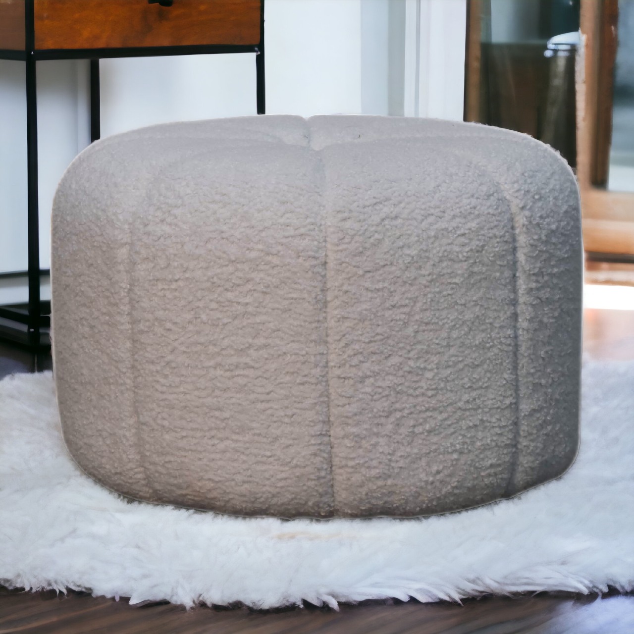Enhance your bedroom or living room with the addition of this exquisite and trendy footstool. Wrapped in a delightful white boucle fabric, it brings a touch of elegance to your space. Perfect for resting your feet, serving as a handbag stand, or as a stylish accent piece, it effortlessly complements any corner of your home.