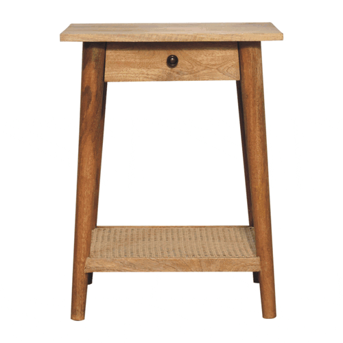 This end table is the perfect addition to any room. Suitable for narrow hallways as an ideal place to store small items like keys and address books. It is constructed from 100% solid mango wood and has a lovely oak-ish finish with a jute bottom shelf. Other features include tapered legs and a round shiny knob for the drawer.